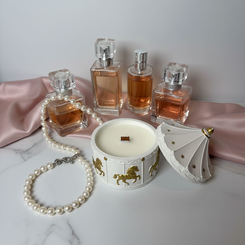 Each candle is individually handcrafted from stonecast, creating a smooth, solid base that mimics the texture of fine ceramic. The body of the candle features elegant golden carousel horses, meticulously hand-painted to perfection. The removable roof-shaped lid completes the look, turning this candle into a timeless festive keepsake.